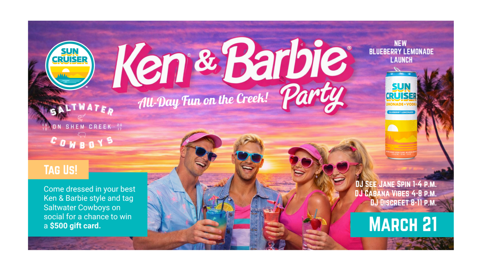 MOUNT PLEASANT, S.C. (March 10, 2026) – On Saturday, March 21, Saltwater Cowboys will become a playful pink paradise for its Ken & Barbie Party, debuting Sun Cruiser’s new Blueberry Lemonade canned beverage. The themed event will take place throughout the day, with doors opening at 11 a.m. until the music stops at 11 p.m.