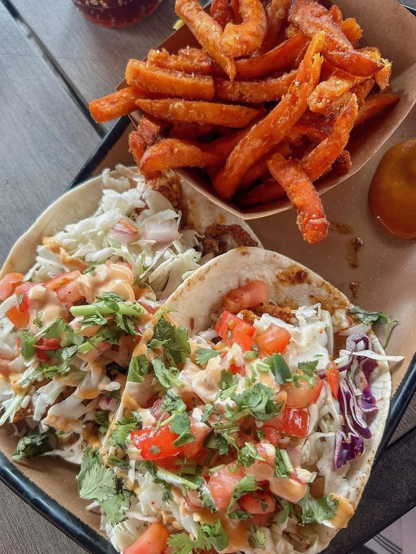 Cowboy Tacos – Flour tortillas, black beans, pico, cabbage, chipotle aioli